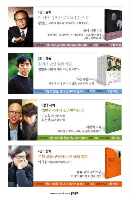 신청 마감은 1강(황현산) 2월 10일, 2강(김병종)·3강(이승욱·김은산) 2월 12일, 4강(이진경) 2월 19일입니다. 당첨자는 마감일로부터 이틀 뒤에 발표하며, 개별적으로 연락드립니다.
