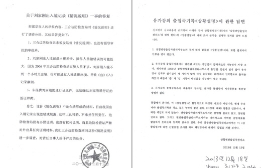 이른바 유우성 사건 또는 '서울시 공무원 간첩사건'에서 검찰이 유 씨가 간첩임을 입증할 증거라며 법원에 제출한 문건은 총 3가지다. 유 영사가 공증한 것으로 돼 있는 싼허 세관의 '회신'과, 유 씨의 출입경기록, 그리고 출입경기록을 발급한 것으로 돼 있는 중국 지린(吉林)성 허룽(和龍)시 공안국의 '출입경기록 발급사실 확인서(확인서)'다.