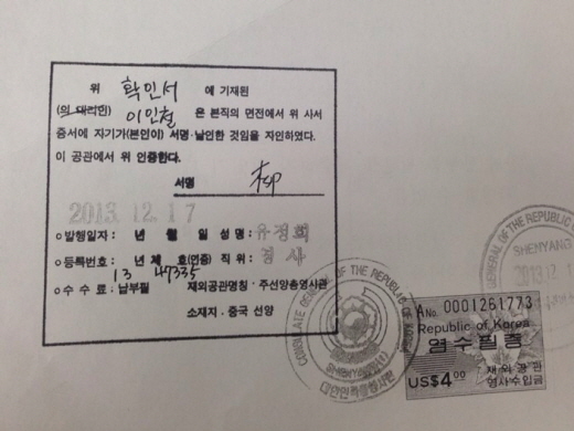 ▲검찰이 싼허 세관에서 발급했다며 법원에 제출한 '회신' 문서에 첨부된 영사확인서의 서명. 국정원 직원이라는 의심을 받고 있는 이인철 영사의 요청에 의해 공증담당 유정희 영사가 공증한 것으로 돼 있고, 유 영사의 성을 한자로 쓴 것으로 보이는 '유(柳)'라는 서명이 있다. ⓒ민변