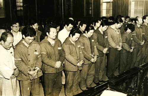 ▲1974년 7월 이른바 '울릉도간첩단 사건' 피의자들이 재판을 받고 있다. 울릉도 간첩 조작 사건은 유신 정권 하에서 조작된 대표적인 간첩 사건이다. 47명이 검거됐고 3명이 사형당했다. '사법살인'이었다. 이 사건은 훗날 재심을 통해 조작이 만천하에 드러났다. 이들의 잃어버린 삶은 그러나, 누가 보상해줄까. 박정희 정권은 살인을 저지르고 어떤 대가를 치렀나. ⓒ연합뉴스