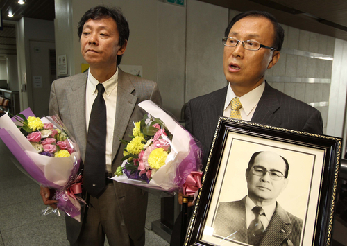 ▲김대중 내란음모 사건의 한 원인을 제공했던 '재일동포 유학생 간첩사건'으로 실형을 선고받고 복역했던 김정사(오른쪽)씨와 유성삼씨가 34년 만에 무죄를 선고받고 서초구 서초동 고등법원에서 소회를 밝히고 있다. 2011.9.23 ⓒ연합뉴스