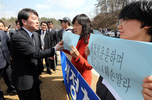 한편 안 의원과 나란히 5.18 묘지를 참배하고 대전·광주시당 창당대회에 참석한 민주당 김한길 대표는 국립묘지 방명록에 "광주와 호남의 뜻을 받들어 2017년 정권교체를 실현하겠습니다"라고 적었다.