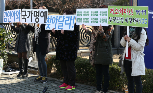 ▲'피겨여왕' 김연아의 2014 소치 동계올림픽 편파 판정에 항의하는 팬들이 21일 오전 서울 송파구 올림픽회관 앞에서 대한체육회와 빙상경기연맹에 제소를 촉구하는 시위를 하고 있다. ⓒ연합뉴스