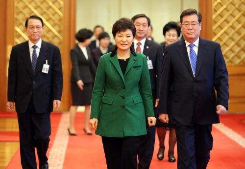 ▲박근혜 대통령과 김기춘 비서실장(왼쪽), 황찬현 감사원장(오른쪽) ⓒ청와대
