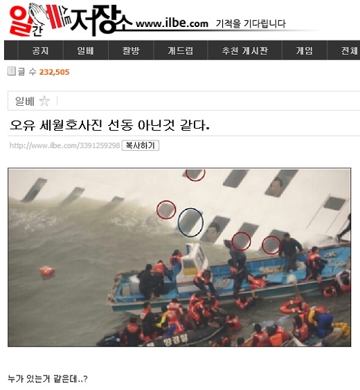 극우 성향의 인터넷 사이트 일간베스트(일베)가 또 구설수에 올랐다. 23일 한 누리꾼은 침몰하는 세월호 유리창 안에 김대중, 노무현 전 대통령의 얼굴이 있는 것처럼 합성해 놓은 사진을 일베에 올렸다.