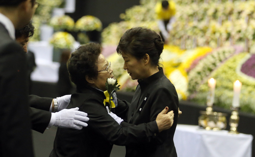 ▲박근혜 대통령이 29일 안산 합동분향소를 찾아 유족으로 보이는 여성을 위로하고 있다. 그러나 유가족대책위원회에 참여했던 한 유족은 이날 라디오 인터뷰에서 이 여성에 대해 "(유족 중) 아는 분이 아무도 없다"고 했다. ⓒ연합뉴스