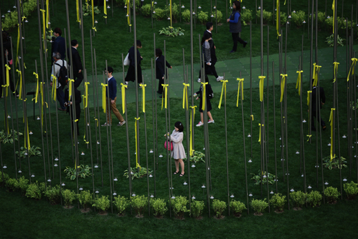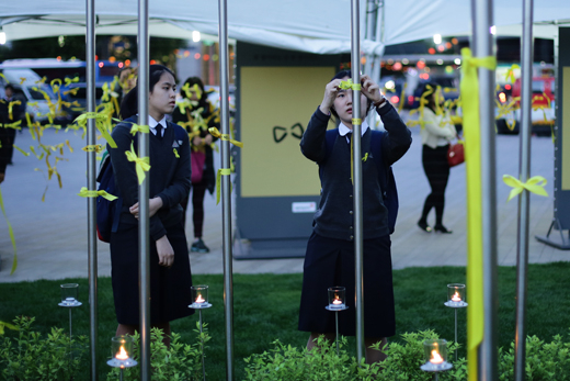 이날 장희정(41) 씨는 중학교 1학년 딸아이와 초등학교 4학년 아들과 함께 노란 리본을 묶었다. 두 아이 모두 학원에 다니는데 오늘은 안 보냈다고 했다. 장 씨는 "학원이 중요한 게 아니고, (희생자들을) 생각하는 마음이 중요하다고 생각해서 왔다"고 말했다.