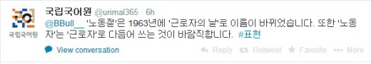 국립국어원은 이날 오후 소셜네트워크서비스(SNS) '트위터' 계정에 올린 글에서 "'노동자'는 '근로자'로 다듬어 써야 바람직하다"고 했다.
