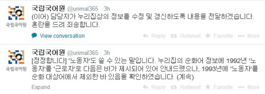 국어원은 논란이 일자 이날 저녁 다시 트위터를 통해 "'노동자'도 쓸 수 있는 말"이라며 "1993년 '노동자'를 순화 대상어에서 제외한 바 있음을 확인했다. 혼란을 드려 죄송하다"는 입장을 밝혔다.