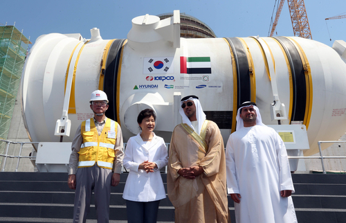 ▲박근혜 대통령이 20일 오후(한국시간) 아랍에미리트 바라카 핵발전소 기공식에서 기념촬영을 하고 있다. 왼쪽부터 조환익 한국전력 사장, 박 대통령, 만수르 UAE 부총리, 하마디 UAE 원자력공사 사장. ⓒ연합뉴스