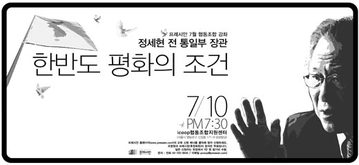 일시: 7월 10일 오후 7시 30분 장소: icoop협동조합지원센터(서울시 영등포구 신길동 171-9 삼성빌딩 4층) 강좌: 한반도 평화의 조건(정세현 전 통일부 장관)
