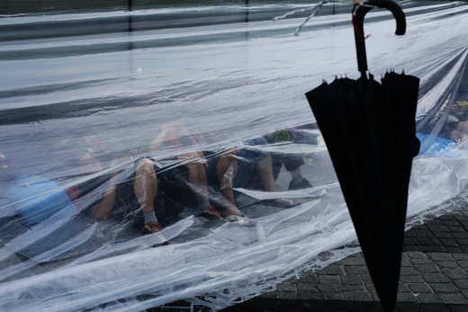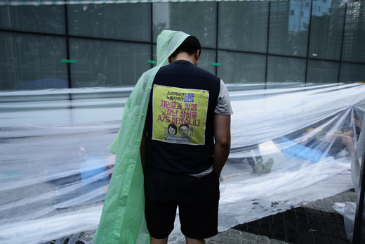 ▲ 삼성전자서비스지회 조합원들이 비를 피해 비닐로 만든 간이 천막 안에 들어가 있다. ⓒ프레시안(최형락)