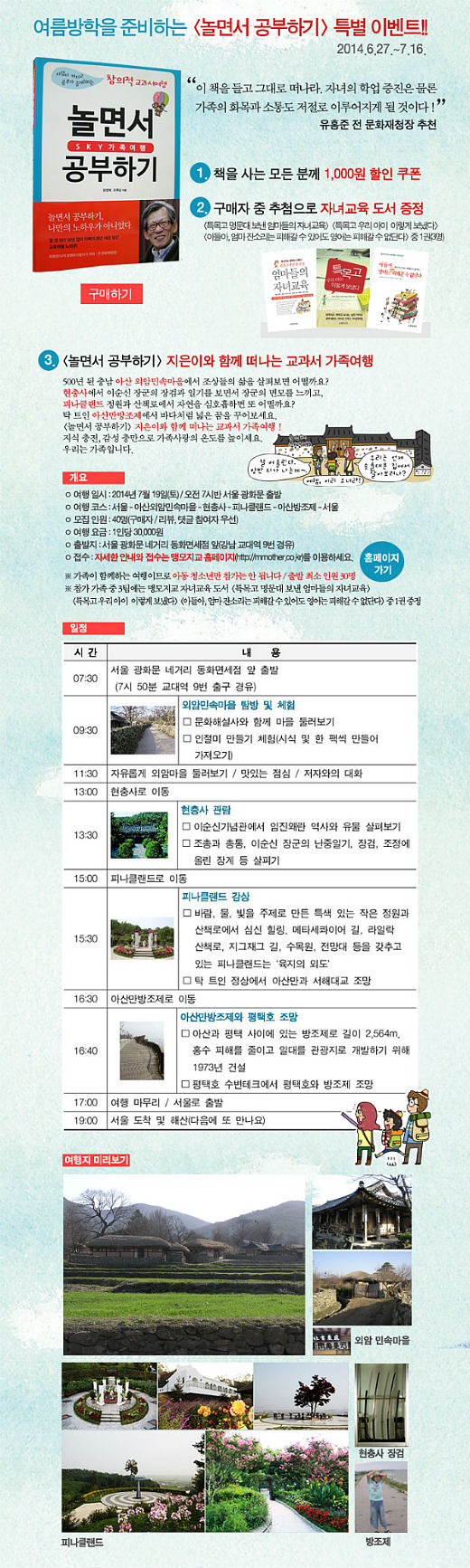 여름 방학을 맞아 아이들과 함께 지식을 충전하고 감성을 나눌 수 있는 이번 행사에 학부모 여러분들의 많은 관심 부탁드립니다. (문의 : 02-395-2442, 도서출판 맹모지교)