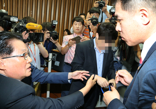 ▲새정치민주연합 박지원 의원이 7일 국회에서 열린 국정원장 인사청문회에서 국회 경위(오른쪽)에게 국정원 직원의 신분 확인을 요구하고 있다. 박 의원은 국정원 직원이 야당 의원들의 책상에 놓인 질의자료를 카메라로 촬영했다고 주장했다. 2014.7.7 ⓒ연합뉴스