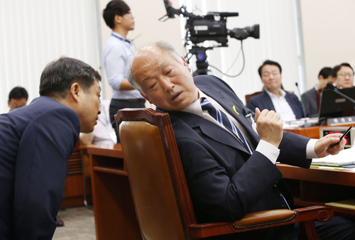 ▲김명수 교육부장관 후보자가 청문회 도중 교육부 공무원으로 보이는 인사에게 귀를 기울이고 있다. ⓒ연합뉴스