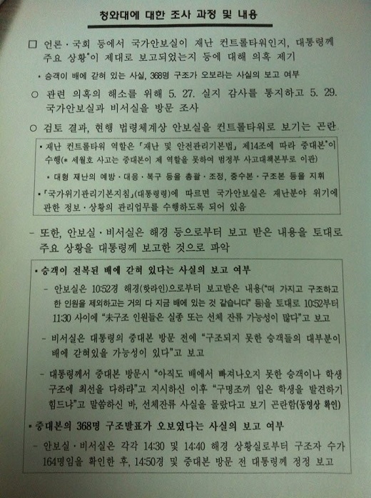 감사원은 청와대에 대해 5월 27일 실지 감사를 통지하고 5월 29일 단 하루 국가안보실과 비서실을 방문 조사했다. 안전행정부, 해양수산부, 해양경찰청 등에 대해 1단계 13일, 2단계 10일 등 총 23일을 쏟아부은 것과 대조된다.