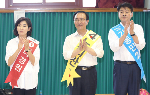 ▲7·30 재보궐선거 서울 동작을에 출마한 새누리당 나경원(왼쪽), 새정치민주연합 기동민(오른쪽), 정의당 노회찬 후보가 20일 오후 서울 동작중학교 드림관에서 열린 사당2동 어머니 배구단 창단식에서 박수를 치고 있다 ⓒ연합뉴스