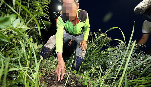 ▲유병언으로 추정된 변사체가 발견된 전남 순천시 서면 신촌리의 모 야산 밑 밭에서 변사체를 처음 발견한 마을 주민이 아직 현장에 남아있는 변사체의 머리카락과 뼈조각을 가리키고 있다.ⓒ연합뉴스