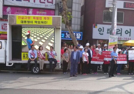 27일 오후 나 후보의 지하철 7호선 남성역 유세 현장에서, 나 후보 측 선거운동원 3명은 "진실규명! 특별법 제정!", "대통령이 책임져라!" 등의 문구가 적힌 현수막과 함께 세월호 사고 추모 영상이 나오고 있는 트럭에 올라 앉았다. 남성 2명과 여성 1명 등이었다.