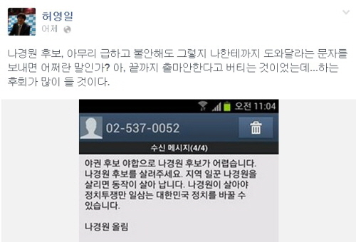 나 후보 측의 문자메시지를 받은 새정치연합 허영일 부대변인에 따르면, 이 메시지는 "야권 후보 야합으로 나경원 후보가 어렵습니다. 나경원 후보를 살려주세요. 지역일꾼 나경원을 살리면 동작이 살아납니다. 나경원이 살아야 정치투쟁만 일삼는 대한민국 정치를 바꿀 수 있습니다. 나경원 올림"이라고 돼있다.