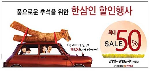 한편, (주)농협홍삼 한삼인에서는 민족 최대 명절 추석을 맞아 홍삼 제품을 최대 50%까지 할인 판매한다. 행사 기간 중 파우치 포장의 홍삼음료 ‘홍삼플러스’와 갱년기 여성에 좋은‘더블오365’, 씹어 먹는 비타민제 ‘홍센멀티비타민’은 50% 할인된 가격에 판매한다. 홍삼성분캅셀골드 등 다른 제품들(일부 제품은 한정 판매)도 33%에서 10%까지 할인된 가격에 구매할 수 있다.