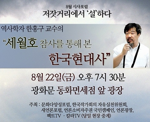 역사학자 한홍구 교수의 “세월호 참사를 통해 본 한국현대사” 저잣거리 강연이 22일(금요일) 오후 7시 30분 서울 광화문 동화면세점 앞 광장에서 열린다.