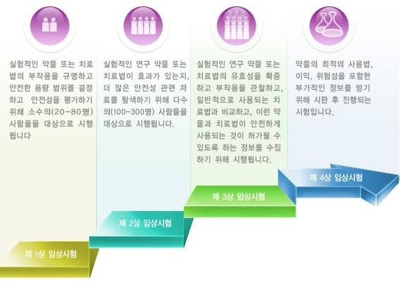 ▲ 일반적인 임상시험 절차. 1상 임상시험이란 수십 명의 건강한 사람들을 대상으로 진행하는 안전성 평가다. ⓒ식약처
