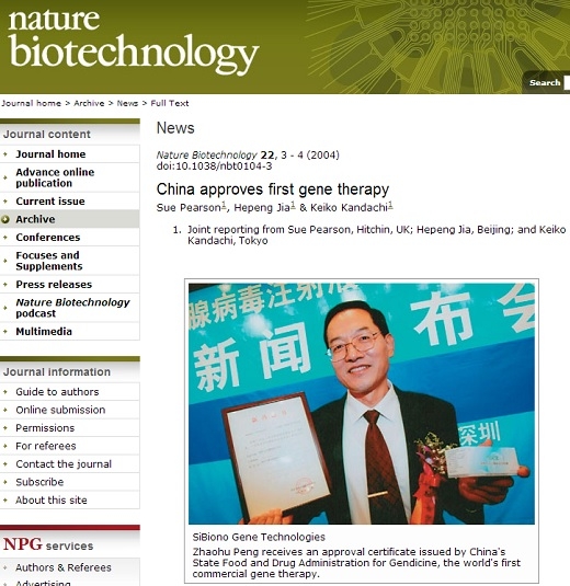 Sue Pearson 등, <China approves first gene therapy>, nature biotechnology, 2004-3, 4