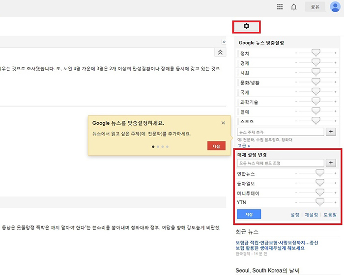로그인 하시면 위 그림처럼 뉴스 개인화 설정이 가능한 설정화면이 생성됩니다. 톱니 버튼(화면 오른쪽 위 붉은 박스로 표시된 버튼)은 언제든 뉴스 설정을 변경하실 수 있는 화면입니다.