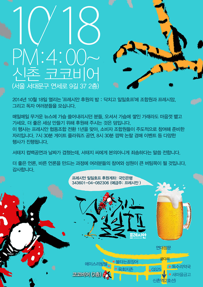 작지만 강한 언론, 프레시안 조합원임을 서로 확인하고, 언론 협동조합의 미래를 이야기해보고자, 대의원들과 20~30대 열혈 조합원들이 뭉쳐 장을 마련하기로 했습니다. 그래서 탄생한 '닥치고 일일호프'는 직원 조합원, 소비자 조합원들의 행사입니다. 우리 얼굴 한번 봅시다! 미친듯이 보고싶습니다!