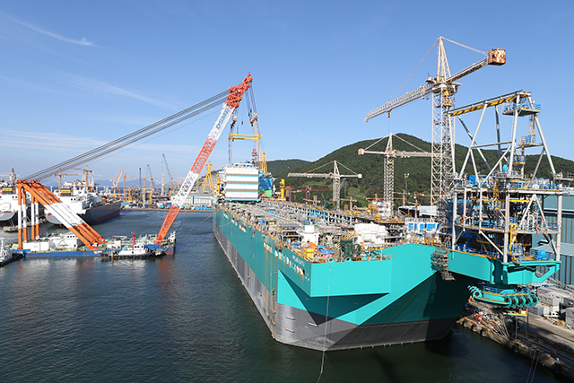 ▲ 대우조선해양 옥포조선소에서 건조 중인 FLNG 첫 상부 구조물을 해상 크레인으로 탑재하는 모습. ⓒ대우해양조선