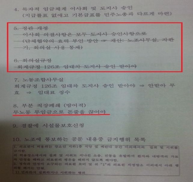특히 이 문건의 '부분 직장 폐쇄' 항목에는 "무노동 무임금으로 돈줄을 끊어야"라는 말이 적혀 있었다. 노동조합 활동을 채증하기 위해 아르바이트생을 고용할 때는 "노동부 시간제 일자리 지원금을 활용하되, 여성 조합원이 많은 바, 알바생도 여성을 많이 모집"하라는 문구도 적혀 있었다.