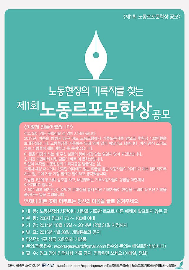노동현장의 기록자를 찾는 제1회 노동르포문학상 신청이 10월 15일부터 12월 31일까지 진행된다. 당선작 1편에는 상금 50만 원과 기념품이 증정된다.
