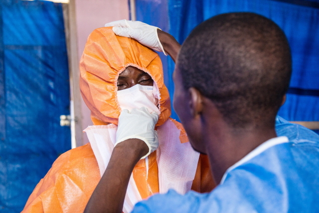 ▲에볼라 감염자를 돌보는 의료요원이 보호장비를 착용하고 있다. 이렇게 착용해도 에볼라에 감염되고 있다.ⓒAP=연합뉴스