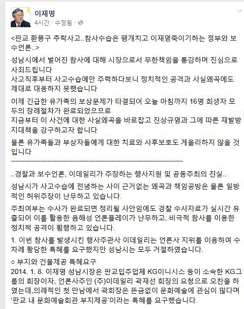 이 시장은 21일 자신의 페이스북에 '판교 환풍구 추락사고…참사 수습은 팽개치고 이재명 죽이기 하는 정부와 보수언론'이라는 장문의 글을 통해 "성남시가 사고 수습에 전념하는 사이 근거없는 왜곡과 책임공방은 물론 일방적인 허위주장이 난무하고 있다"고 주장했다.