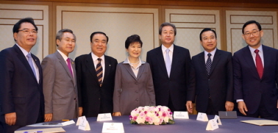 ▲박근혜 대통령이 29일 국회 귀빈식당에서 여야 지도부와 회동을 갖고 기념촬영을 하고 있다. 왼쪽부터 새정치연합 백재현 정책위의장, 우윤근 원내대표, 문희상 비대위원장, 박 대통령, 새누리당 김무성 대표, 이완구 원내대표, 주호영 정책위의장. ⓒ연합뉴스