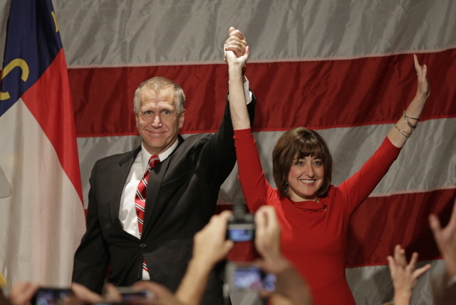 ▲4일 치러진 미국 중간선거에서 가장 뼈아픈 패배를 안겨준 노스캐롤라이나 주 상원선거에서 공화당의 톰 틸리스 후보가 부인과 함께 승리를 기뻐하고 있다. ⓒAP=연합뉴스