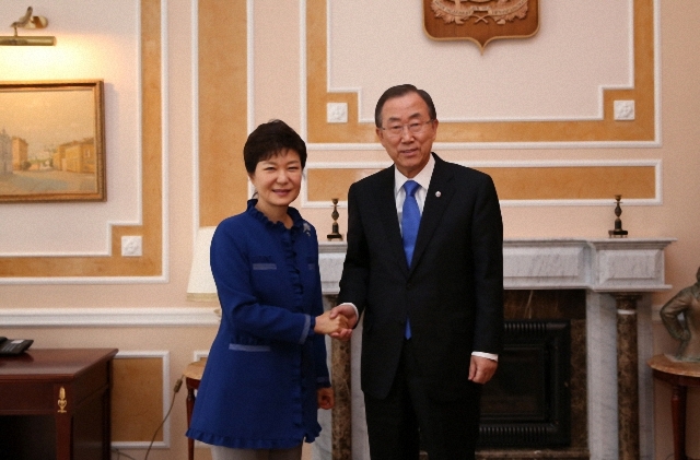 ▲ 박근혜 대통령은 지난해 9월 G20 정상회의 참석차 러시아를 방문해 반기문 유엔 사무총장과 국제 현안과 한반도 문제에 대해 의견을 나눴다. ⓒ청와대