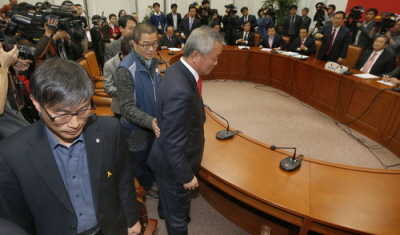 오 위원장은 김 대표가 '답변할 수 없다'고 말하자마자 "이 자리에서 답을 못 주시면 더 얘기할 수 있는 명분이 없다"며 바로 자리에서 일어났다. 안행위 여당 간사인 조원진 의원이 "제가 상임위 간사로서 얘기드리겠다"고 잡으려 했지만 이들은 "일어나. 일어나", "새누리당 홍보해주러 왔어?" 라며 나가 버렸다.