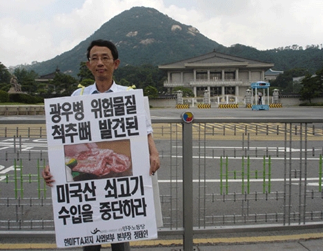 대통령과 FTA공신들이 청와대 안에서 서로를 격려하고 연내 비준의 결의를 다지던 그 시간 청와대 문 앞에선 국민경제비서관을 지냈던 정태인 민주노동당 한미FTA저지 사업본부장이 '미국산 쇠고기 수입 재개 중단'을 촉구하며 청와대 앞 1인 시위를 벌였다.