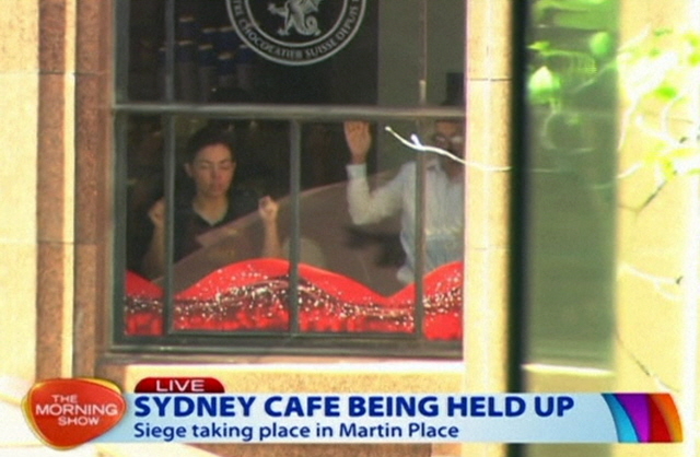 ▲15일 호주 시드니 린트 카페에서 인질들이 창가에서 손을 들고 있다. 비디오 캡처 영상.