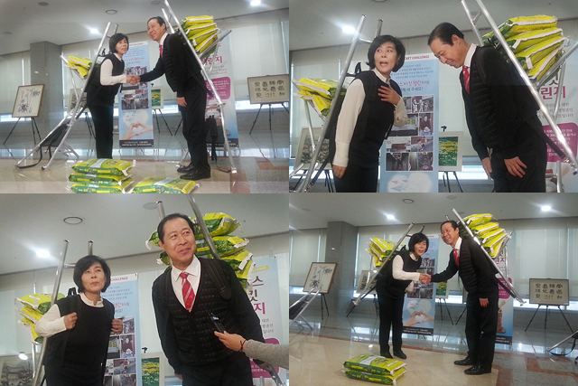 이날 이 의원과 최 의원은 각각 10킬로그램짜리 쌀 5포대와 2포대를 들어 올렸다. 3포대 이상을 들어 올리는 데 실패하면 30킬로그램을 어려운 이웃에게 기부하는 캠페인 규칙에 따라 최 의원은 쌀 기부를 하게 된다.