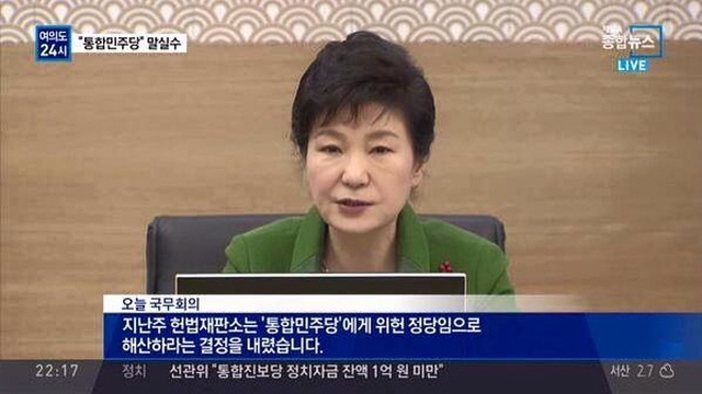 박근혜 대통령이 헌법재판소 결정으로 해산당한 통합진보당을 '통합민주당'으로 잘못 말해 화제가 되고 있다.