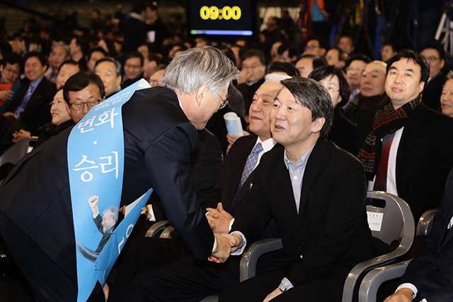 ▲문재인 신임 새정치민주연합 대표가 2.8 전당대회 식장에서 김한길·안철수 전 공동대표를 찾아가 인사하고 있다. ⓒ프레시안(최형락)