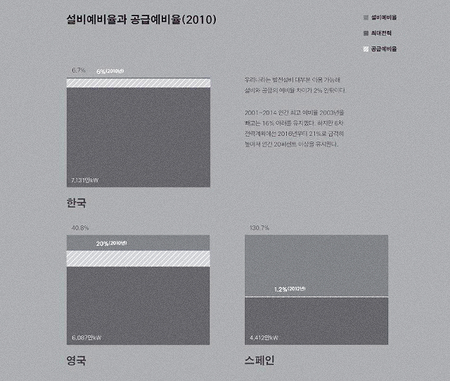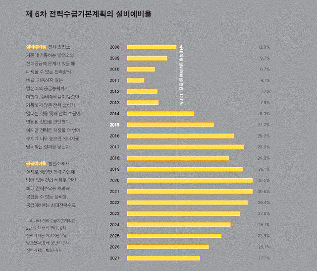 적정 설비예비율은 국가별 전원 구성과 지리 특성에 따라 목표치가 다를 수 있다. 보통 적정 설비예비율은 15%. 이를 유지하면 지나친 설비비용을 줄일 수 있다. 6차 전력계획에는 모든 구간에서 적정 예비율을 넘었다. '7차 전력계획 수립 시에는 높은 설비예비율로 기회비용이 발생할 가능성을 검토할 필요가 있다'고 평가한다. 전력수급 안전성을 결정하기 위해서는 설비용량보다 공급예비율이 필요하다. 한국전력공사는 설비예비율이 높은 나라를 예로 들어 국내 설비예비율이 낮다며 발전소를 계속 지어야 한다고 강조해왔다. 하지만 공급예비율로 보면, 수치는 매우 낮아진다.