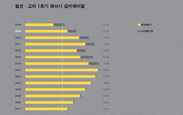 2007년 30년의 설계수명을 끝났지만 2017년까지 10년의 수명연장을 승인받은 고리1호기, 2012년 30년의 설계수명이 끝났지만 2022년까지 가동연장 승인이 결정 난 월성1호기. 지금 이 두 핵발전소를 폐쇄에 따른 설비예비율을 검토한 결과, 2015년부터 적정예비율이 15%를 넘어 2027년까지 전력 수급 문제가 없는 것으로 예측됐다. 그동안 정부가 전력수급문제로 노후원전 가동연장은 불가피하다는 주장은 거짓임이 드러났다. 하지만 이용 가능한 설비용량을 반영한 공급예비율로 하면, 수치는 매우 낮아진다.
