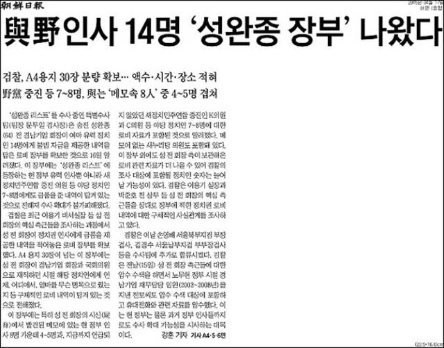 <조선일보>는 지난 17일자 1면 톱기사를 통해, 검찰이 성완종 전 회장이 정치인에게 언제 어디서 얼마를 줬는지 신빙성 있는 자료를 가지고 있다며, '성완종 장부'에 적힌 야당 정치인이 7~8명 있다고 보도했다. 이 신문은 관련해 새정치민주연합의 유력한 중진 정치인인 K의원, C의원이 포함돼 있다고 보도했다. 그러나 검찰은 이같은 장부를 확보했다는 사실을 공식 부인한 상황이다.