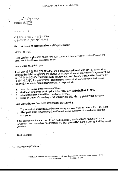 위원회는 이 편지를 근거로 "LKe 설립을 위한 최초의 정식 미팅이 2000년 2월 7일 날 이뤄졌다"고 강조했다.