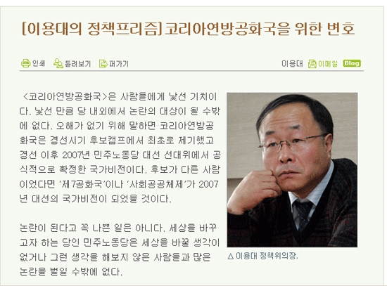 하지만 '코리아연방공화국'은 민노당 국가비전으로 확정됐고 공약자료집에서도 주요한 위치를 차지했다.
