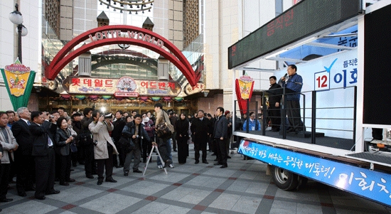 '비장한 각오'에도 불구하고 이 후보가 나선 거리는 쌀쌀했다. 그는 출정식에 이어 가락동 농수산물시장, 잠실 역 등으로 이동해가며 거리 유세에 나섰지만 일반 시민들의 관심도는 지난 두 번의 선거에 비해 확실히 덜했다.